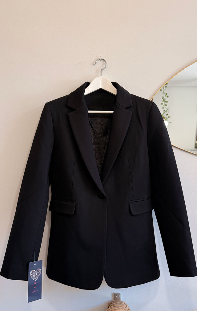 AMERICANA DE CORTE ENTALLADO CON UN SOLO BOTON EN LA CINTURA, TEJIDO ABRIGO Y UN FORRO HACIENDO DIBUJO BROCADO.