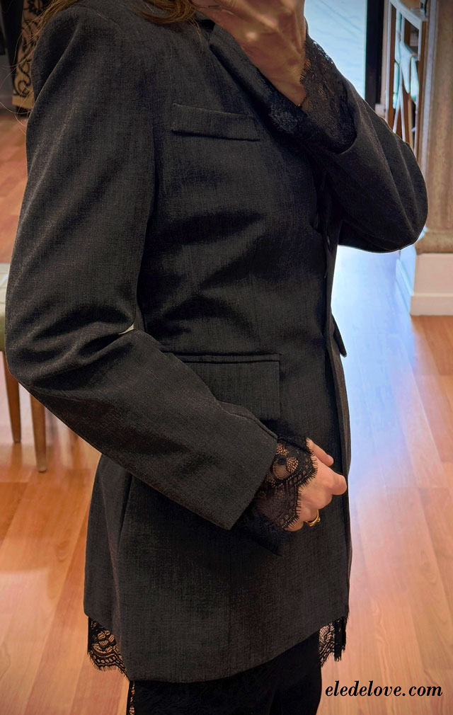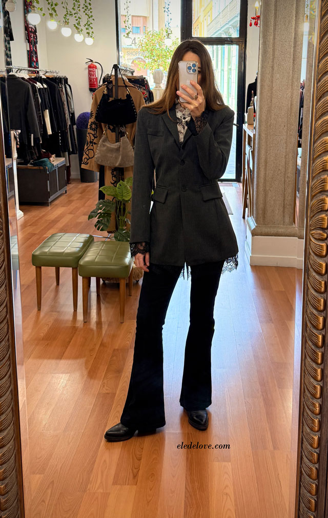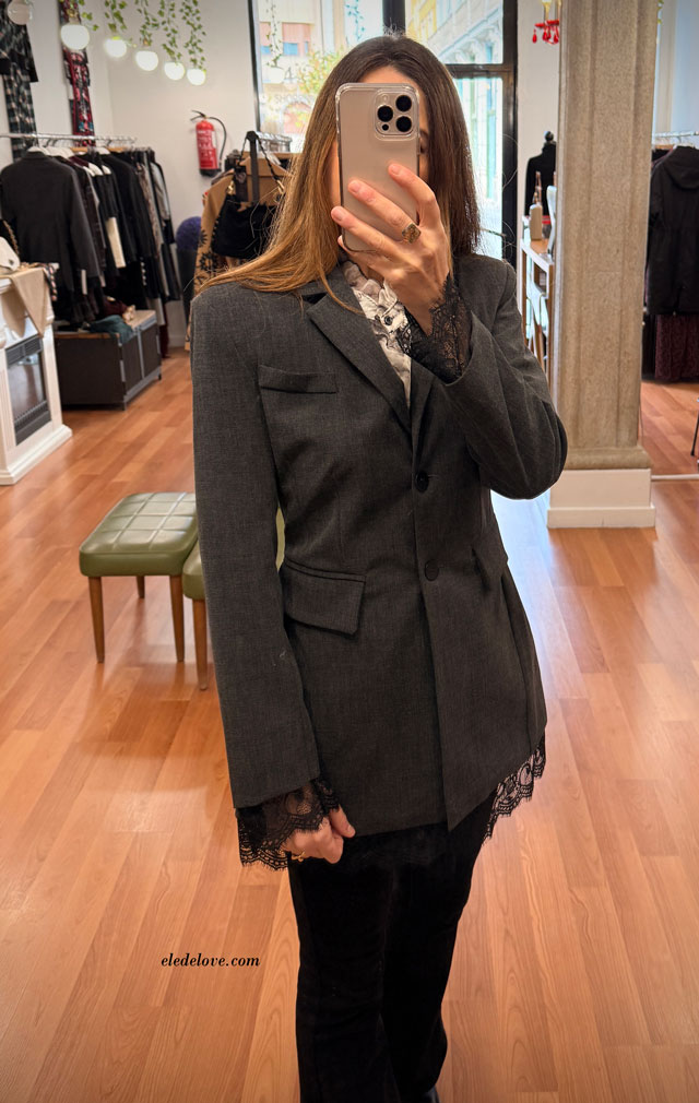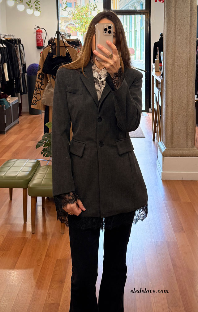 AMERICANA ENTALLADA Y DE CORTE ESTRUCTURADO CON HOMBRERAS MUY MARCADAS, ENTALLE EN LA CINTURA Y FORMA DE LA CADERA, RIBETES DE ENCAJE NEGRO EN LAS MANGAS Y EN EL BAJO, SI ALGUN DIA TE CANSAS DE ESTE DETALLE SE PUEDE QUITAR. CIERRE DE BOTONES DELANTEROS Y BOLSILLOS CON SOLATA.