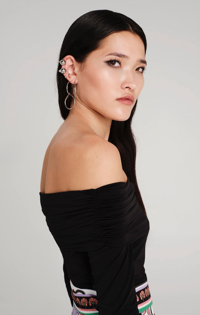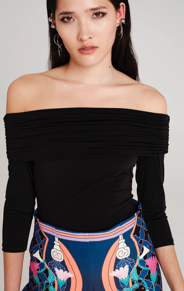 Nuestro top Blackbird con hombros descubiertos es una prenda esencial y elegante. Este top fruncido de manga 3/4 con detalle Chaka metálico está confeccionado en licra elástico negro suave para un look ajustado.