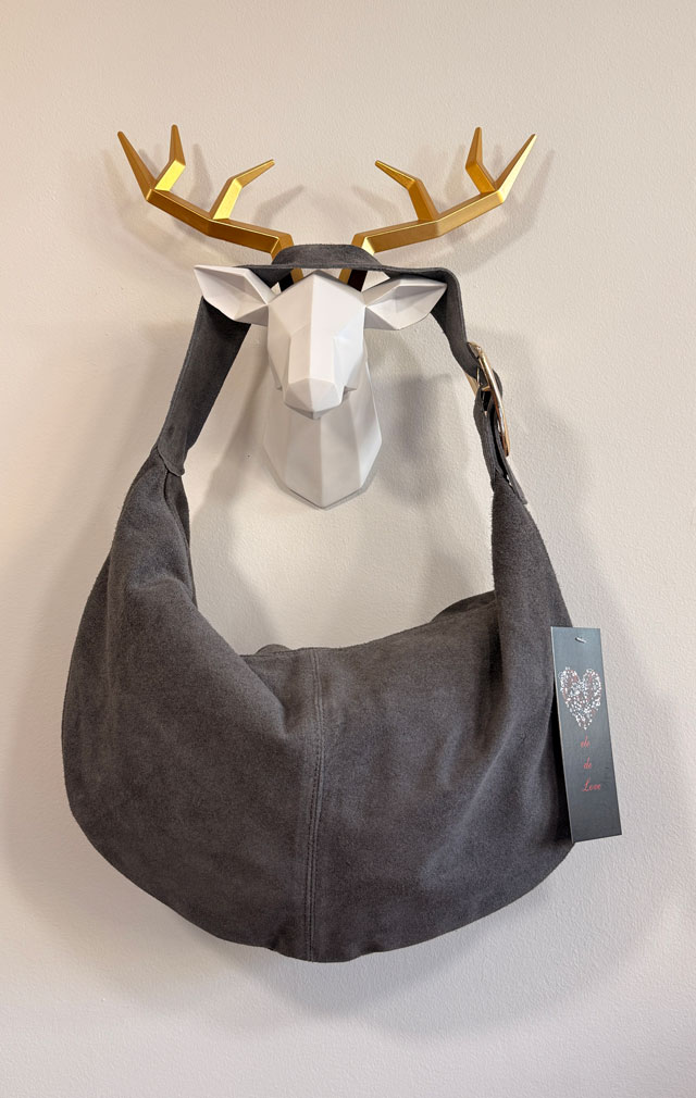 BOLSO DE PIEL VUELTA EN GRRIS CON HEBILLA GRANDE DORADA.