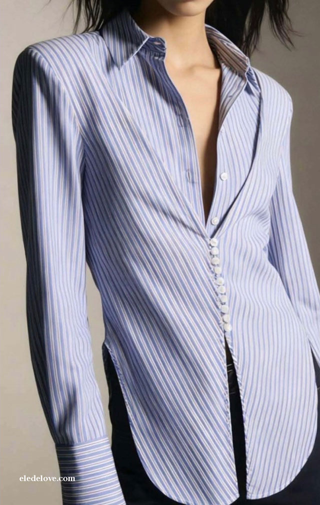 LA TELA DE ESTA CAMISA ES LA CLASICA CAMISA AZUL DE RAYA DIPLOMATICA PERO EL DISEÑO, EL DISEÑO ES ES TODO CON DOBLE BOTONADURA CREANDO UN EFECTO CORSE CON ABERTURAS LATERALES Y HOMBRERAS MUY MARCADAS.