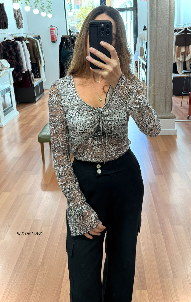 CAMISETA DE ENCAJE SEMI TRANSPARENTE CON ESCOTE PICO.