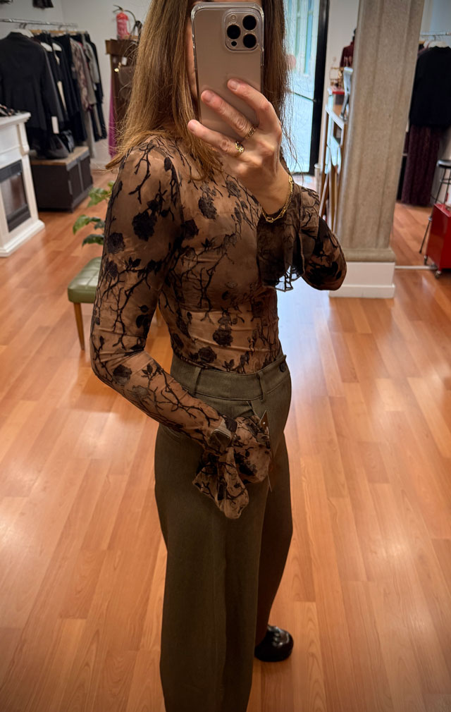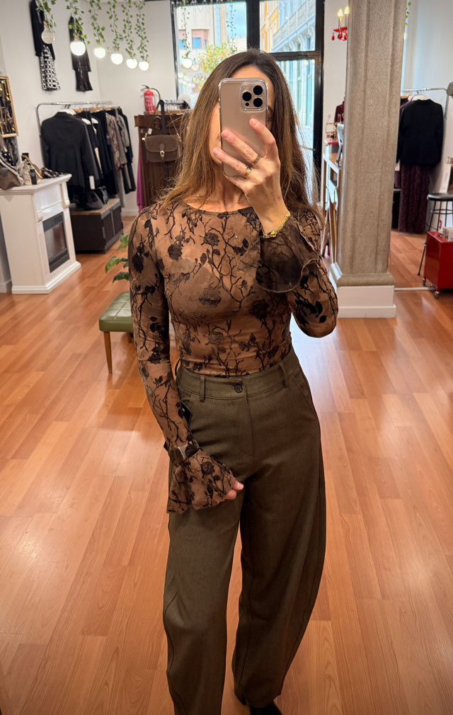 CAMISETA AJUSTADA CON MANGAS EN VOLANTE EN TONOS MARRONES ESTA CAMISETA ES SEMITRANSPARENTE, PUEDES LLEVARLA SOLA, DEBAJO DE UNA AMERICANA O COMPRARLO JUNTO AL JERSEY MARROWN DE MANGA CORTA.