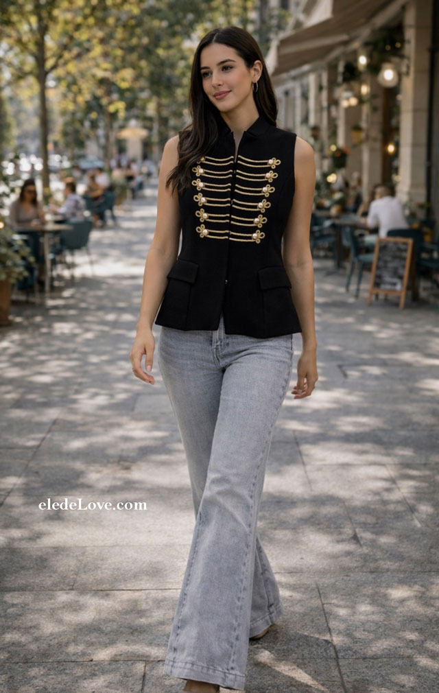 CHALECO ENTALLADA DE ESTILO NAPOLEON CON BOLSILLOS DELANTEROS Y BORDADOS EN COLOR ORO LLEVA FORRO.