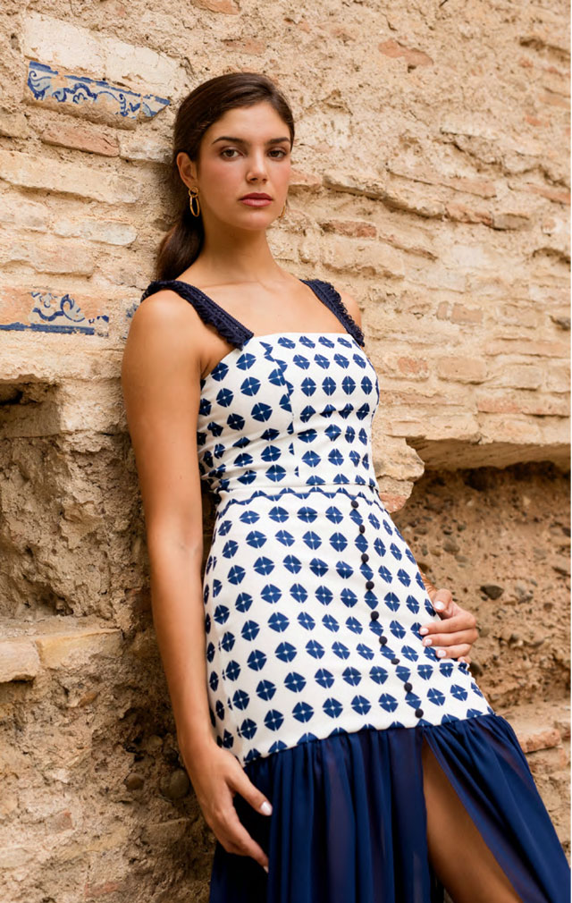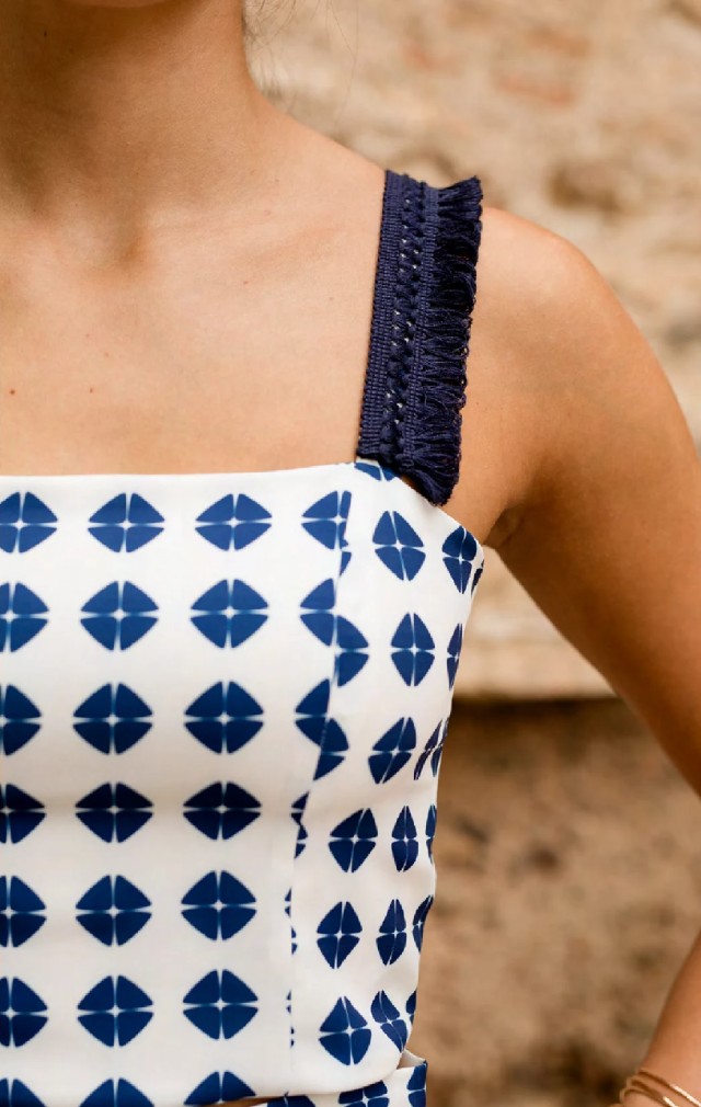 ESTE CONJUNTO DE INVITADA ESTA FORMADO POR UN TOP Y UNA FALDA DE CORTE MIDI, LAS DOS PRENDAS LLEVAN FORRO, LA FALDA VA ENTALLADA EN EL MISMO ESTAMPADO QUE EL TOP Y TERMINA EN TELA DE GASA CON VUELO LO QUE LE DA MUCHO MOVIMIENTO. LO BUENO DE QUE SEAN DOS PRENDAS ES QUE PUEDES PONERLAS POR SEPARADO, COMBINAR TANTO LA FALDA COMO EL TOP CON PRENDAS BASICAS DE TEMPORADA.