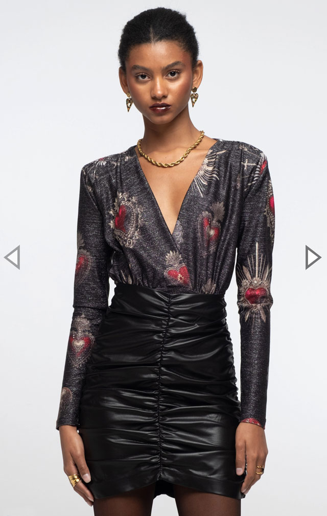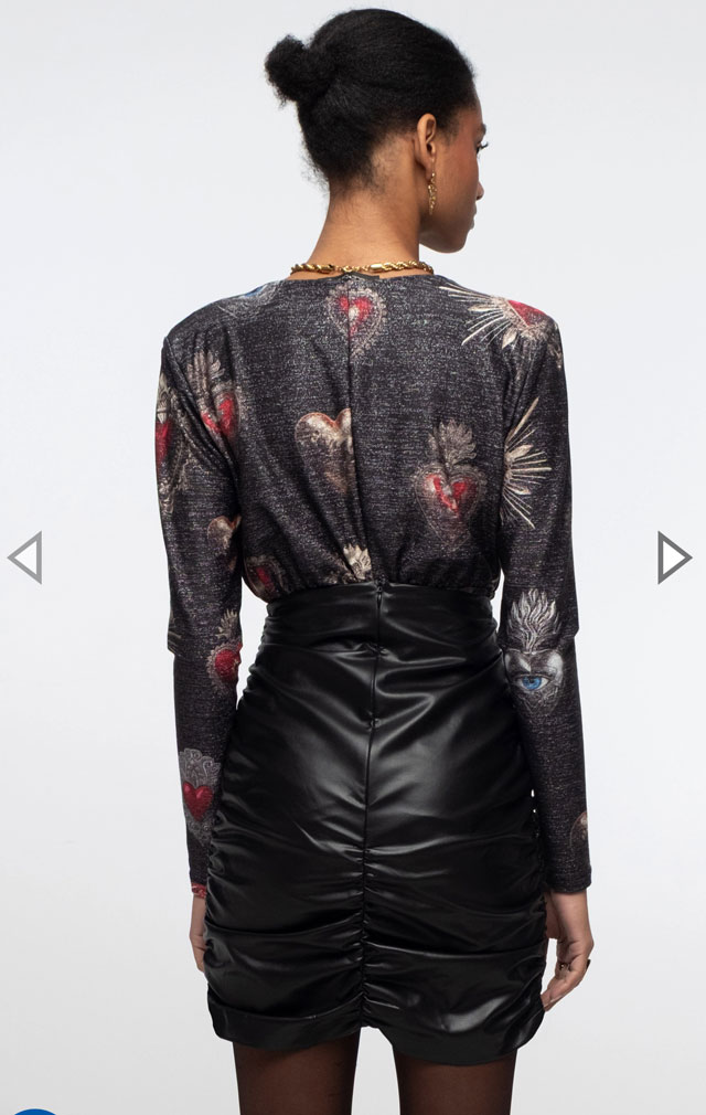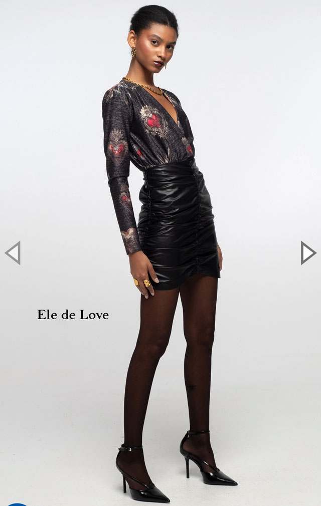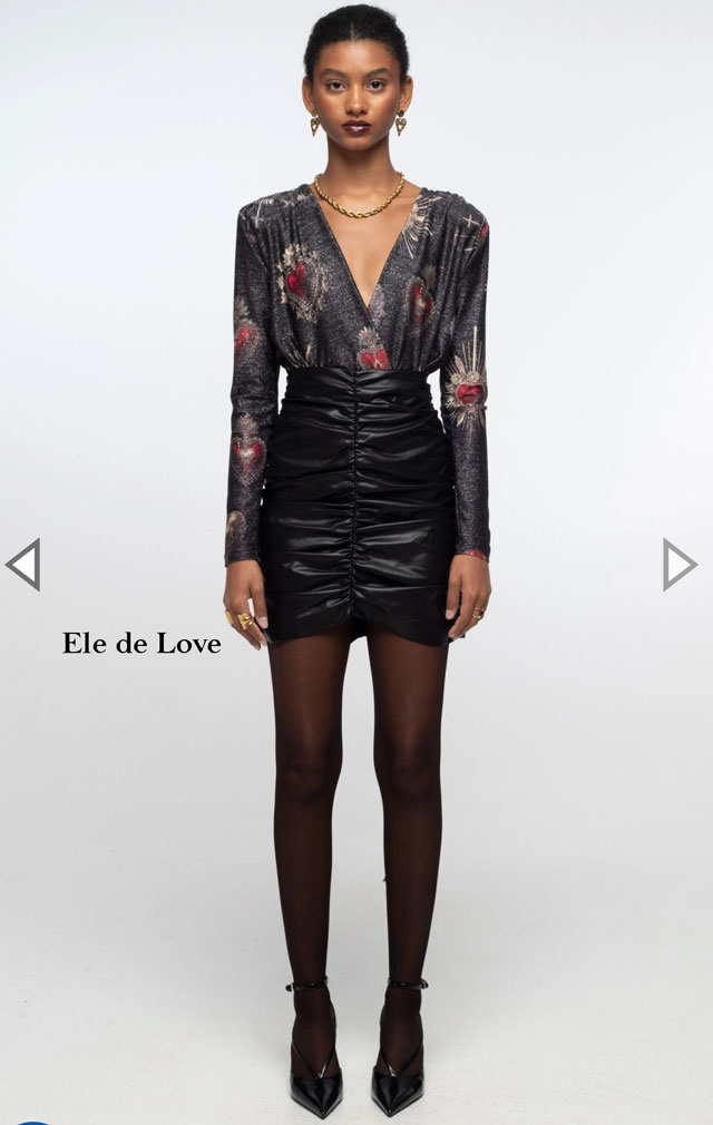 El detalle fruncido elástico en ecopiel le da a nuestra minifalda Ebony un corte ultrafemenino. La cremallera trasera invisible la mantiene elegante, mientras que el detalle metálico Chaka actúa como un talismán. Luce esta falda de cintura alta.