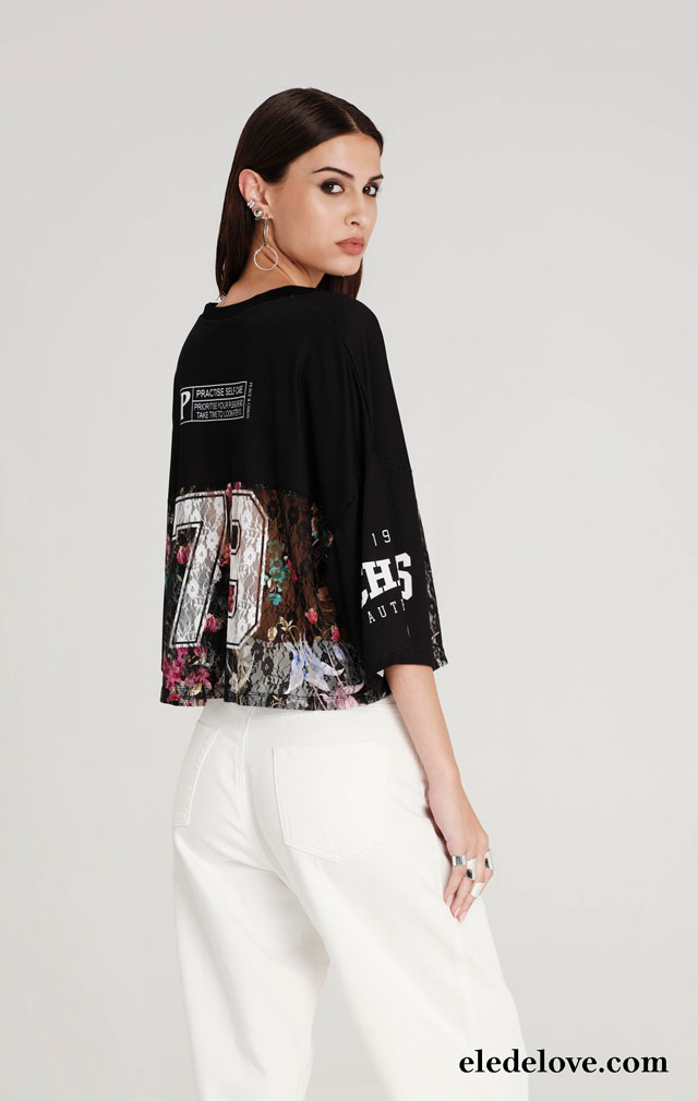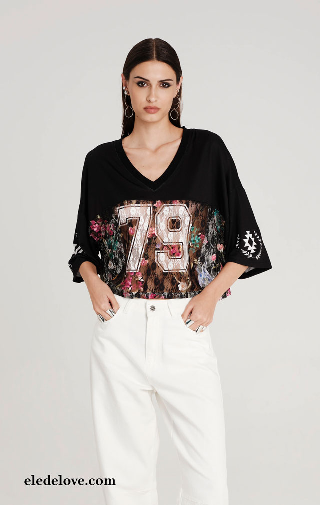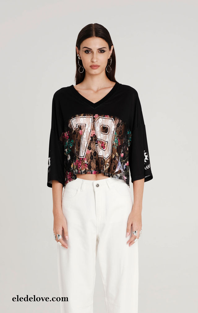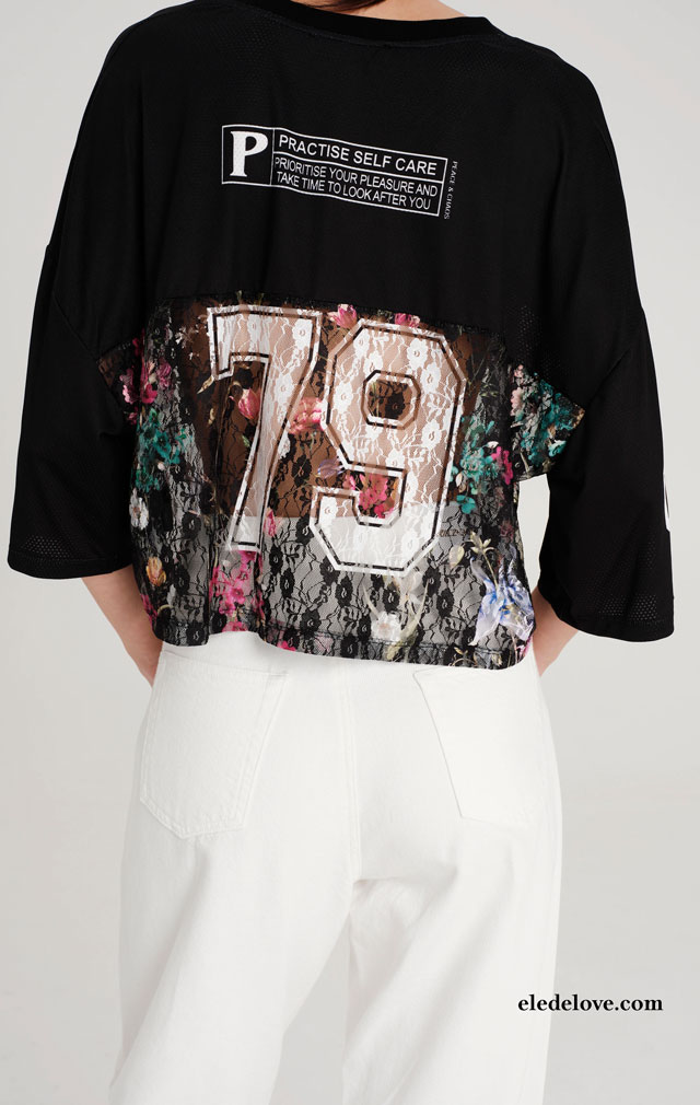 Combinando una malla deportiva de ojo de perdiz y un delicado encaje, nuestro top Flowercore presenta un estampado de motivos deportivos, frases inspiradoras sobre el autocuidado y flores sobre fondo negro. El detalle de canalé en el cuello en V y las mangas extragrandes le dan a este top un aire deportivo y un corte holgado.