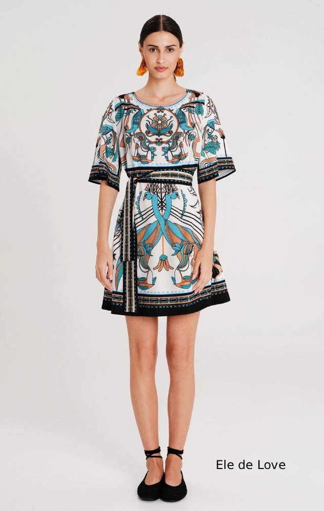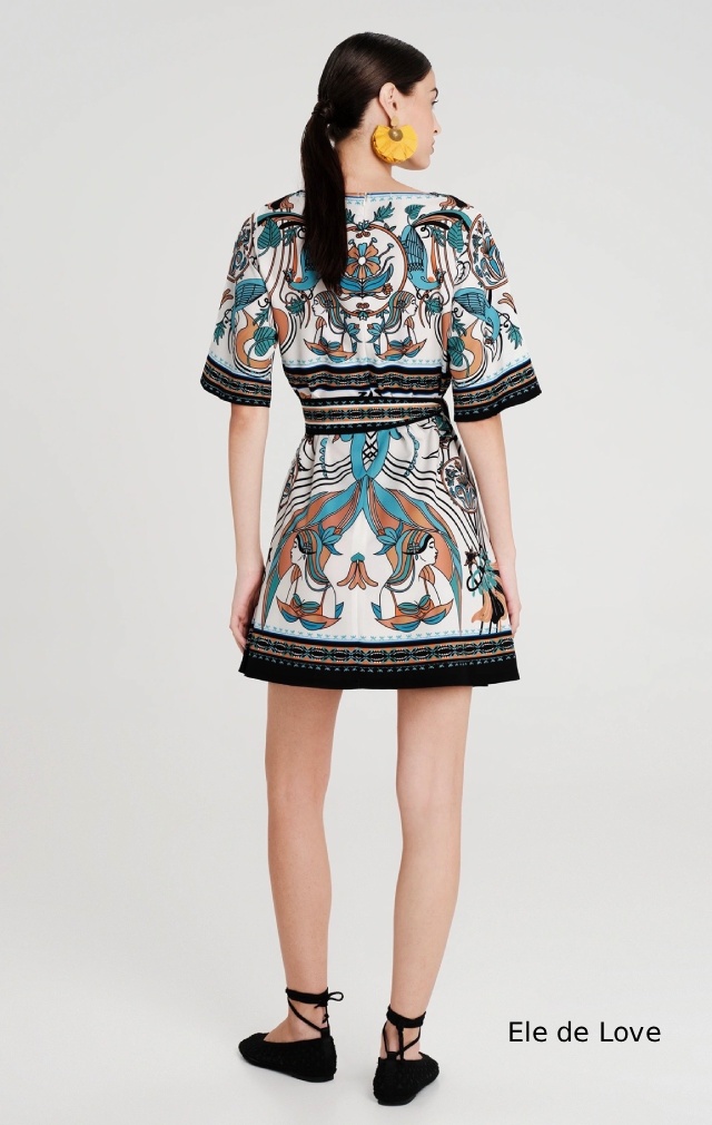 Colores cuidadosamente seleccionados y elementos inspirados en el Art Nouveau se combinan en el estampado ultrafemenino de nuestro vestido corto Fountain. Su silueta en línea A, mangas tres cuartos y detalles en el bajo y la cintura que recuerdan a bordados folclóricos le dan a este minivestido un toque bohemio chic. El cierre de cremallera y el cinturón a juego garantizan un ajuste perfecto. Luce este vestido como una expresión de belleza femenina, conexión y luz.