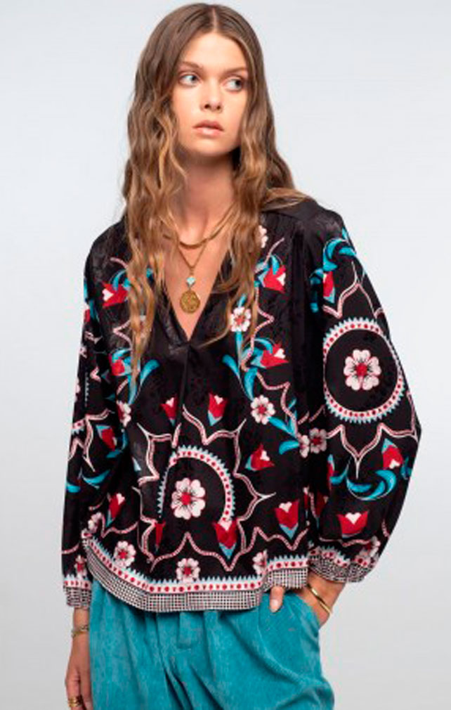 Nuestro top Garland presenta un estampado floral de arte sobre un jacquard de satén botánico negro. Este top incluye elementos típicos de una blusa campesina, como cuello en V y cierre de un solo botón, detalles plisados en el canesú delantero y trasero, y mangas largas con puños elásticos.