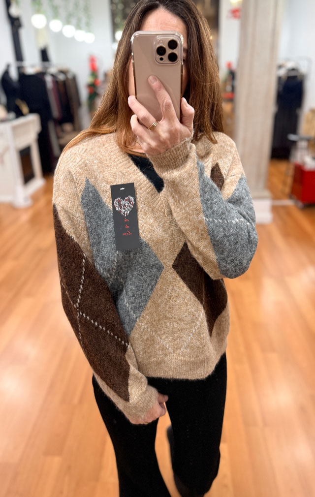 JERSEY DE CORTE AMPLIO EN TALLA UNICA CON ESCOTE EN V LLEVA DIBUJO DE ROMBOS EN TONOS MARRONES Y GRIS EN LA PARTE DELANTERA Y MANGAS, LA ESPALDA EN COLOR LISO.