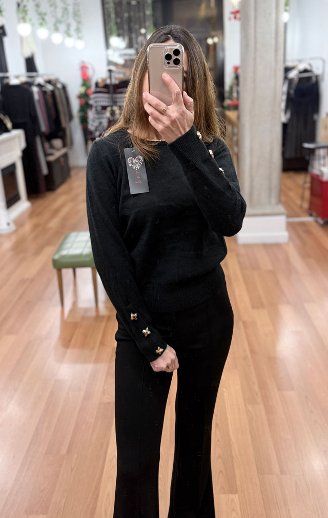 ES EL JERSEY QUE NUNCA PUEDE FALTAR EN UN ARMARIO, UN JERSEY NEGRO SENCILLO DE CUELLO REDONDO NI MUY ANCHO NI MUY ESTRECHO Y CON UN DETALLE, BOTONES JOYA EN LOS PUÑOS.