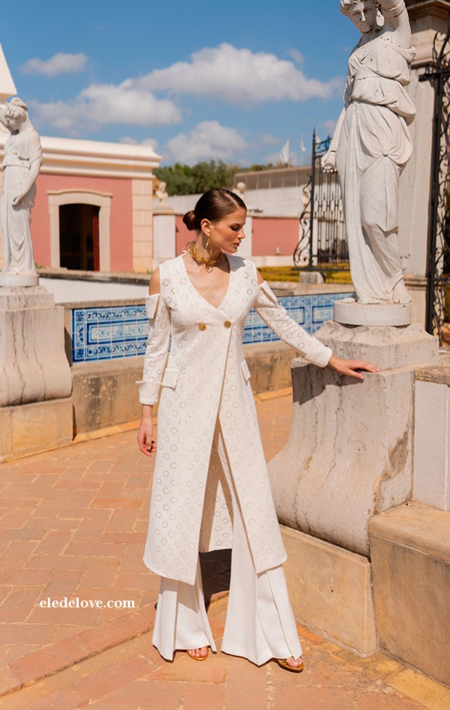 Levita de punto calado con escote en V: elegante y confortable, esta levita de punto calado presenta un escote en V y botonadura dorada que aporta sofisticación. El detalle de doble solapa en las mangas añade un toque único y moderno, pensado para realzar la figura con delicadeza. Ideal para mamás de comunión para un look refinado y cómodo que destaca en celebraciones familiares.