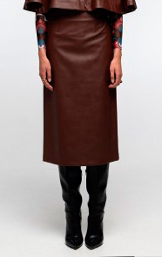 Nuestra falda midi Liquorice te da un toque refinado y femenino. Esta falda tubo de largo medio tiene una cremallera invisible y una abertura en el centro de la espalda para un ajuste elegante. Disponible en un versátil negro o en el clásico marrón otoñal de ecopiel. Llévala con un top de malla Romancer por dentro para lucir el detalle metálico Chaka en la cadera.