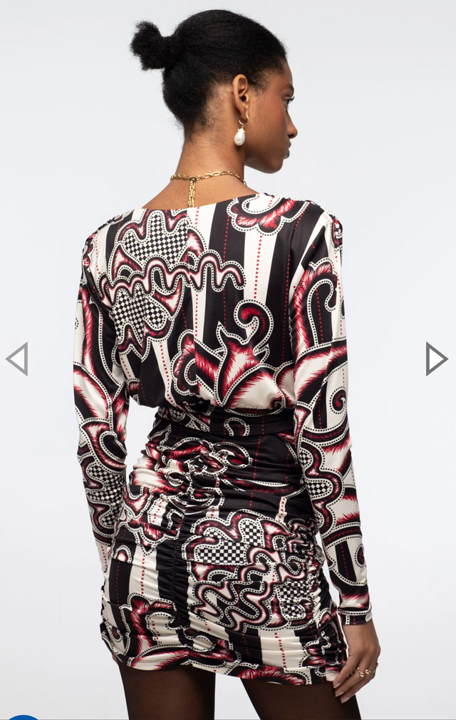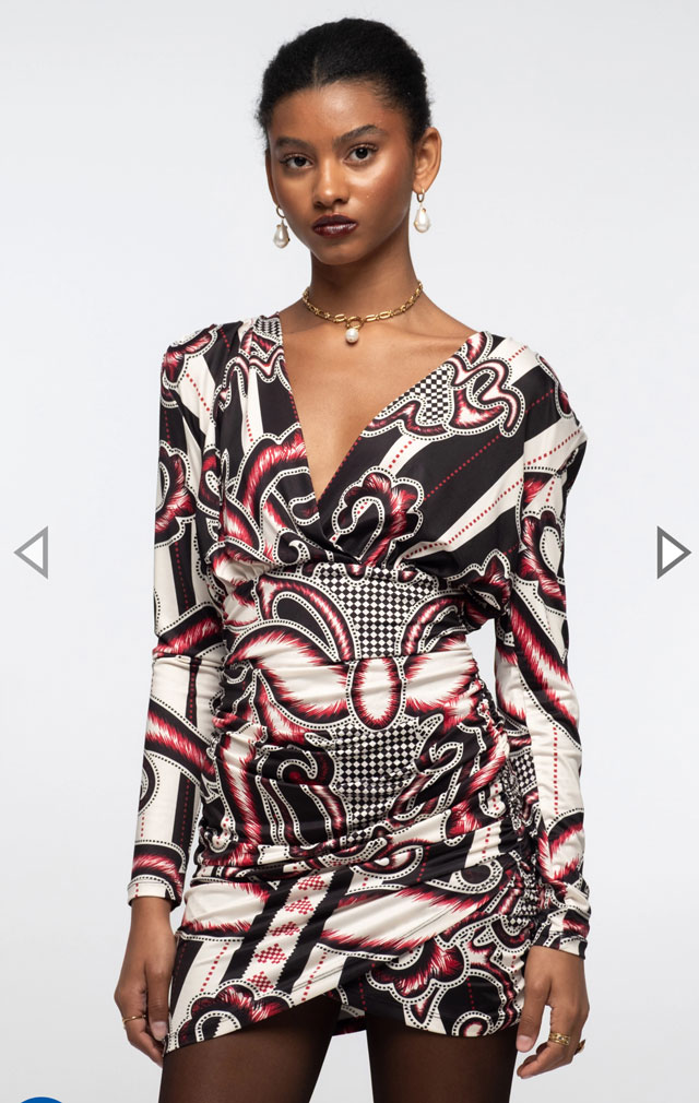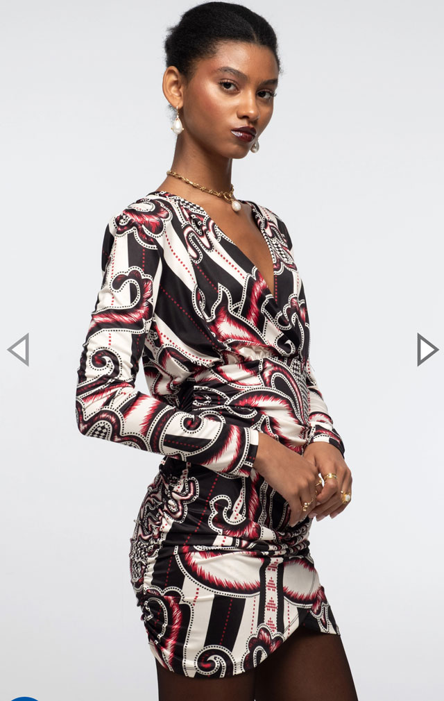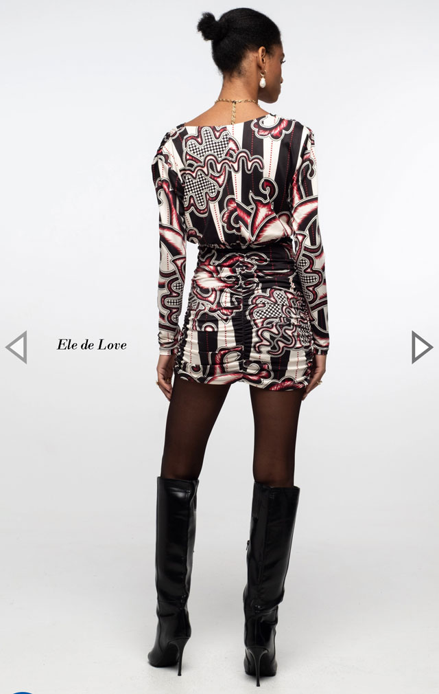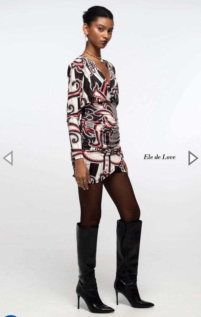 Con un atrevido estampado integral en rojo, negro y crudo, nuestro Vestido Corto Lyrical te cautivará. Su suave tejido elástico y los detalles fruncidos crean un ajuste favorecedor, mientras que la cintura elástica define la figura. Este vestido ajustado presenta mangas ajustadas y un escote cruzado pronunciado que le confiere una energía femenina y refinada.