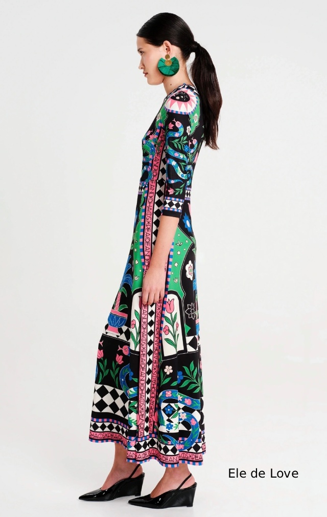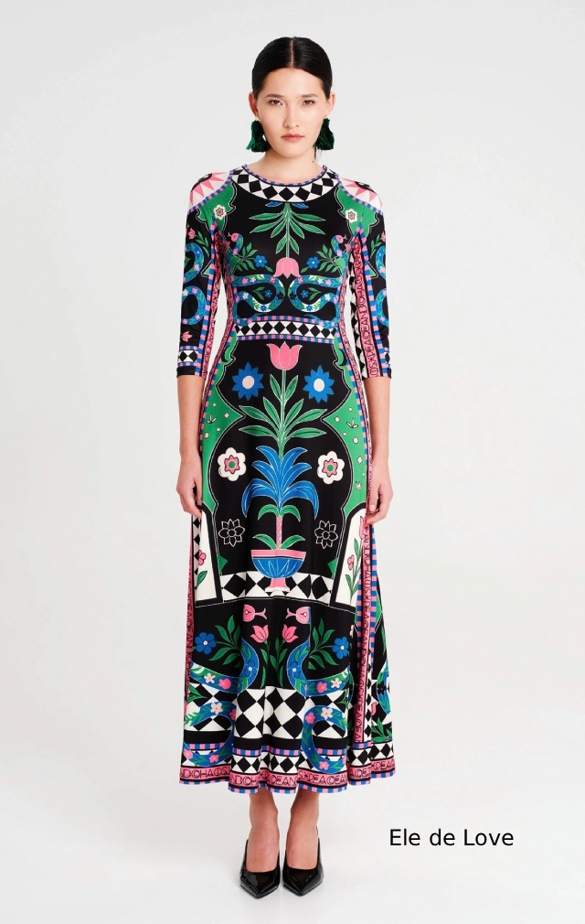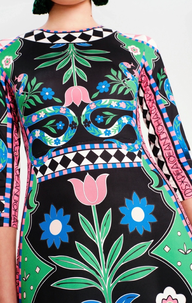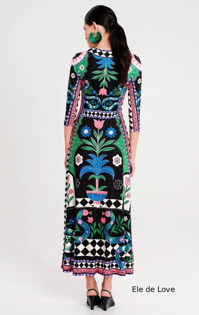 Nuestro vestido largo Manifestation es la elegancia en su máxima expresión. Con una silueta distintiva de la marca que favorece la figura y un estampado estratégico, este vestido largo de corte A está confeccionado en suave tejido de punto elástico. Los detalles geométricos en blanco y negro definen la cintura y enmarcan los motivos del Jardín del Edén inspirados en el arte popular.