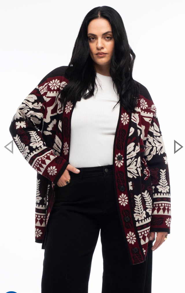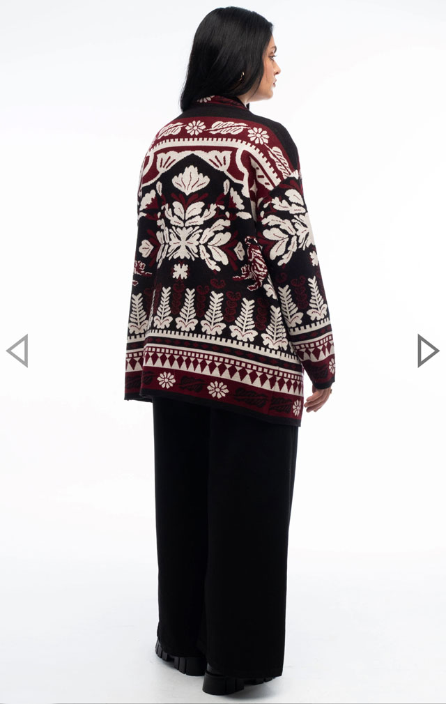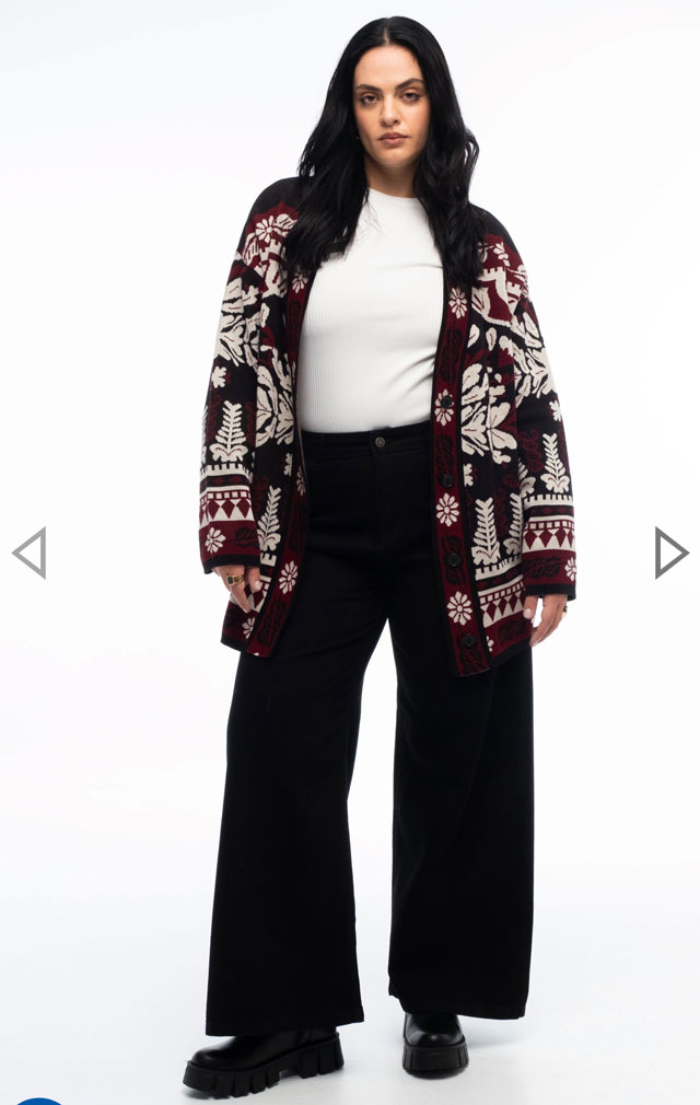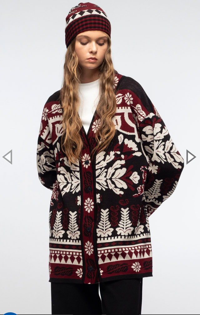 Con un corte holgado, nuestro cárdigan Mythical te mantendrá abrigado este invierno. Un rojo cálido con motivos botánicos en crudo y negro se combina en un punto de inspiración folklórica, confeccionado a la perfección. Este cárdigan de largo medio tiene mangas caídas, un escote en V y se cierra con botones.