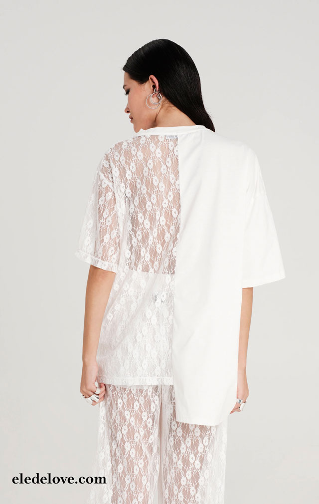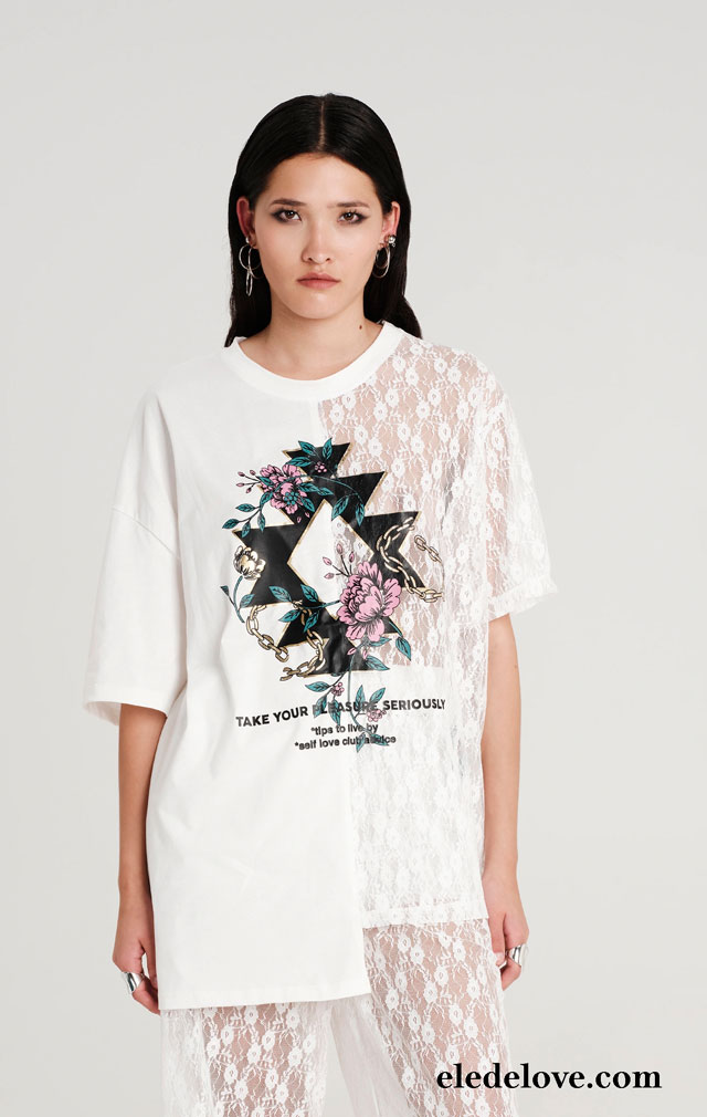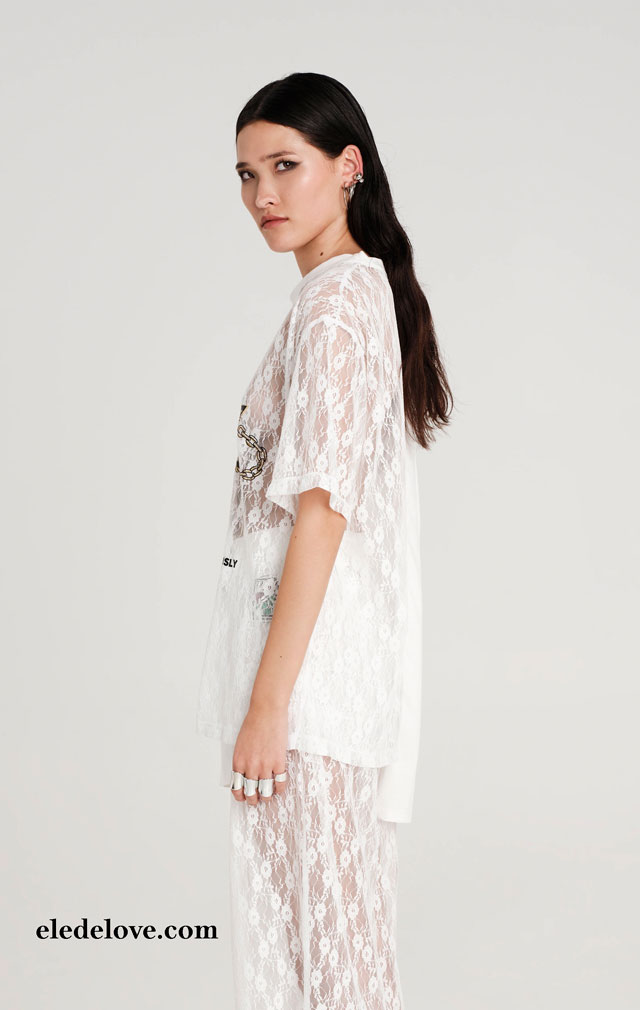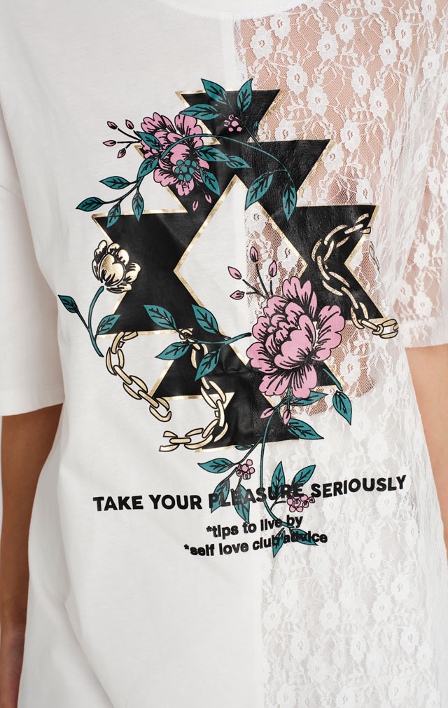 Lleva tu armario casual al siguiente nivel con nuestra camiseta Naturalista. Esta camiseta asimétrica, mitad encaje, mitad algodón, está serigrafiada con un motivo Chaka dorado entrelazado con flores y cadenas. Una etiqueta con diseño botánico estilo sello postal la distingue, mientras que su corte holgado le da un aire urbano sofisticado.