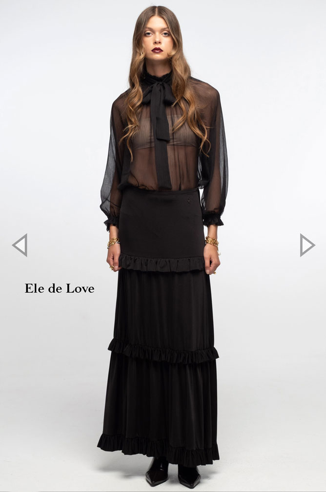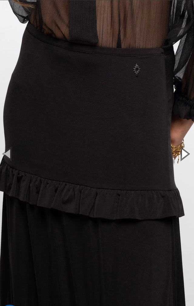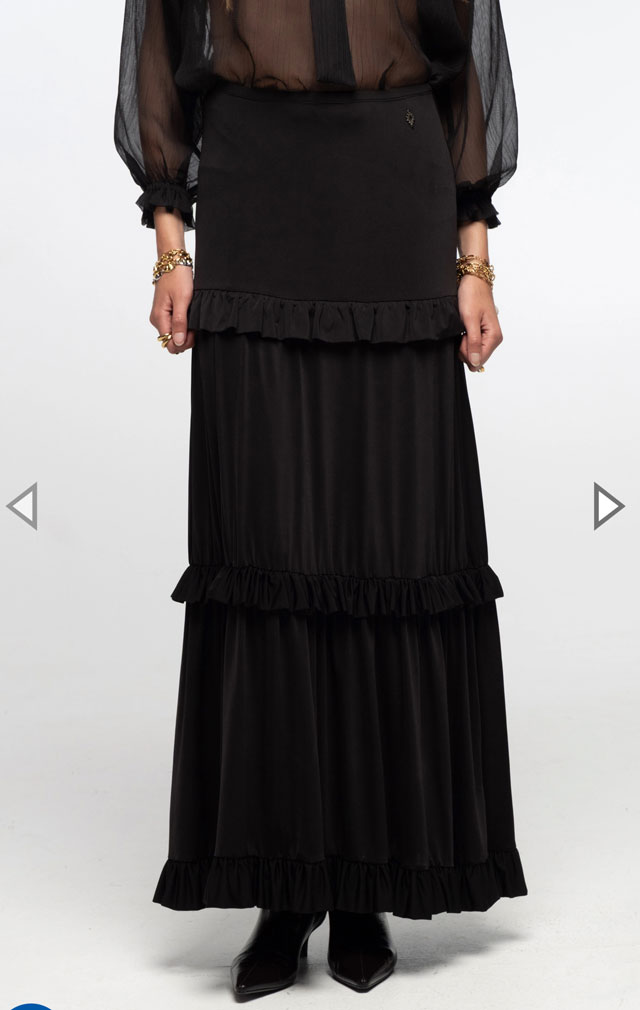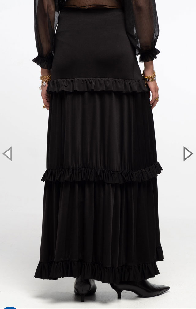 Nuestra falda larga Noir, en un punto negro liso y atemporal, combina elegancia y estilo bohemio. Esta falda maxi escalonada presenta detalles de volantes femeninos, cintura elástica y un ajuste cómodo. El detalle metálico Chaka es un talismán.