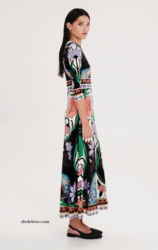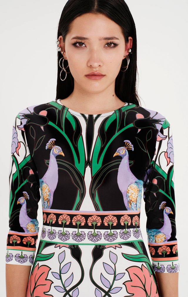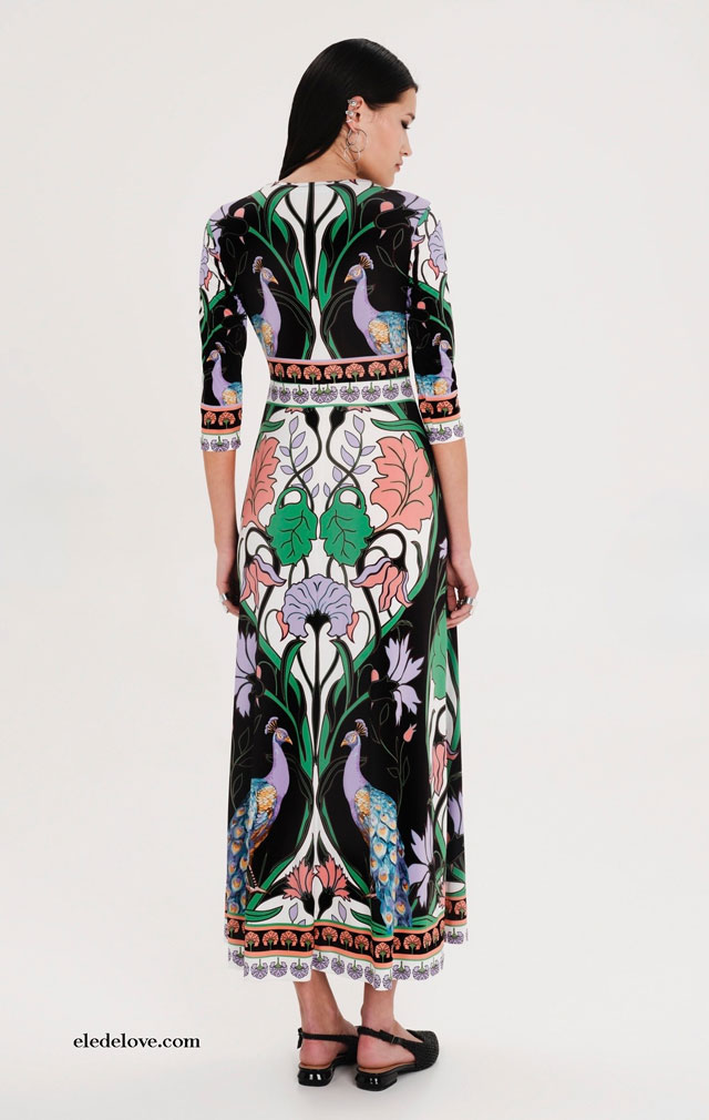 Con la distintiva silueta de la marca en licra elástica suave, nuestro Vestido Maxi Nostalgia se ajusta a la cintura y se completa con una falda evasé. Este vestido largo de manga ¾ luce un estampado que realza la figura con pavos reales simbólicos y la paleta de colores de las aves del paraíso. Llévalo para eventos diurnos, noches de verano o cuando quieras lucir tu verdadero yo.