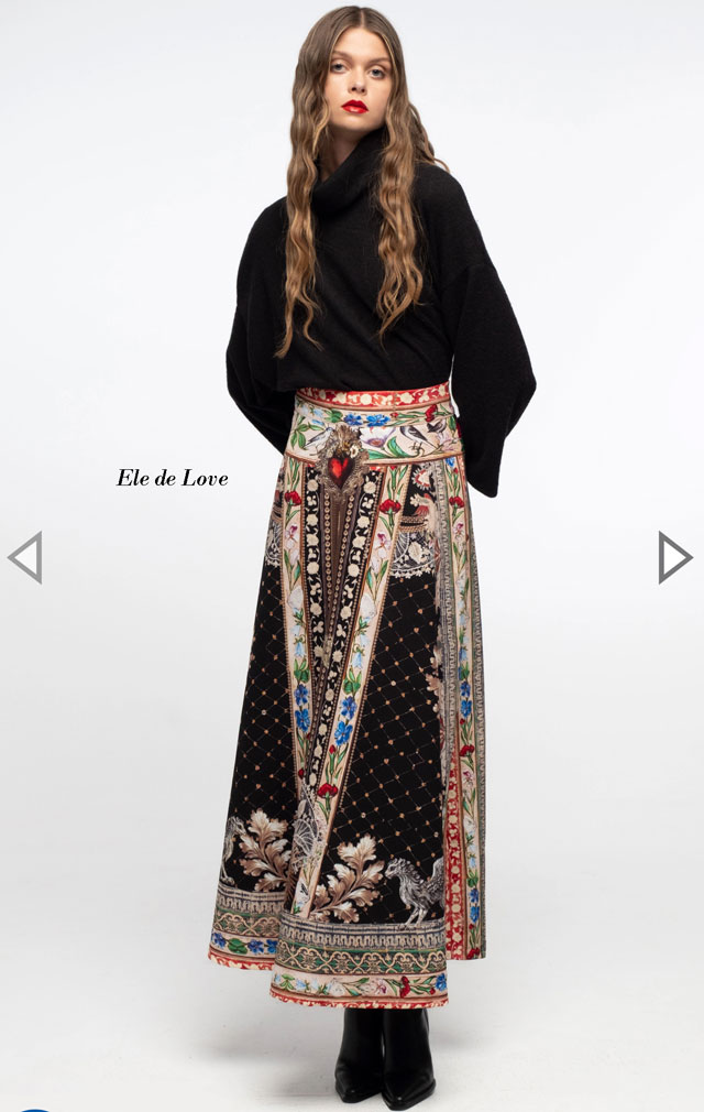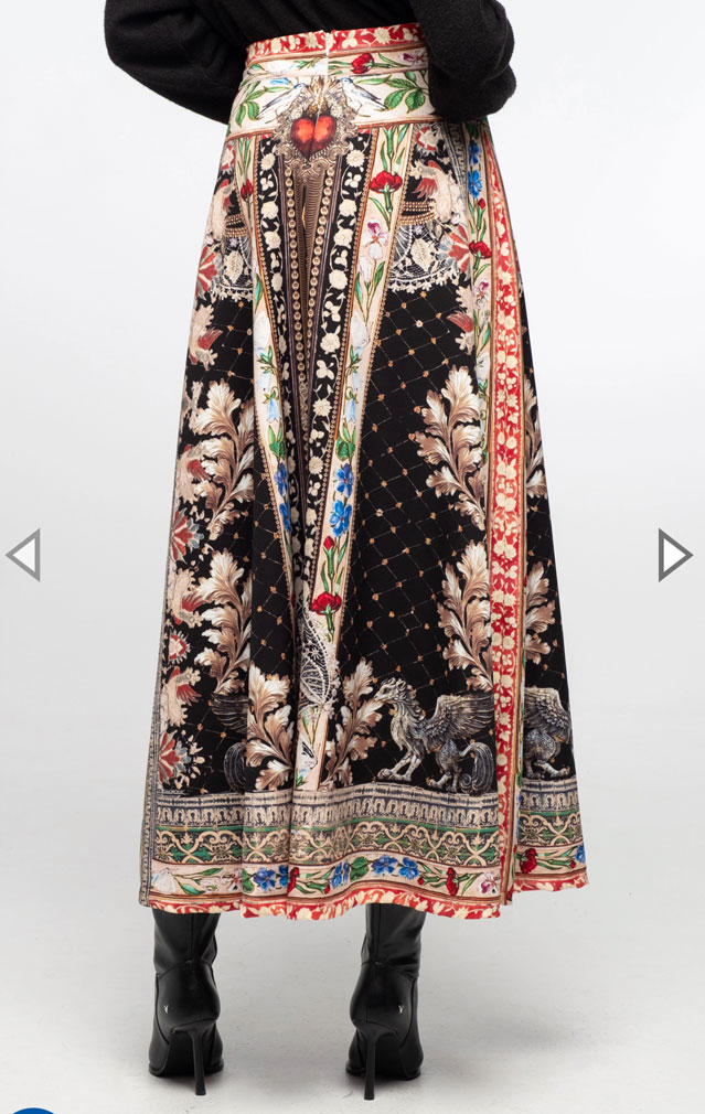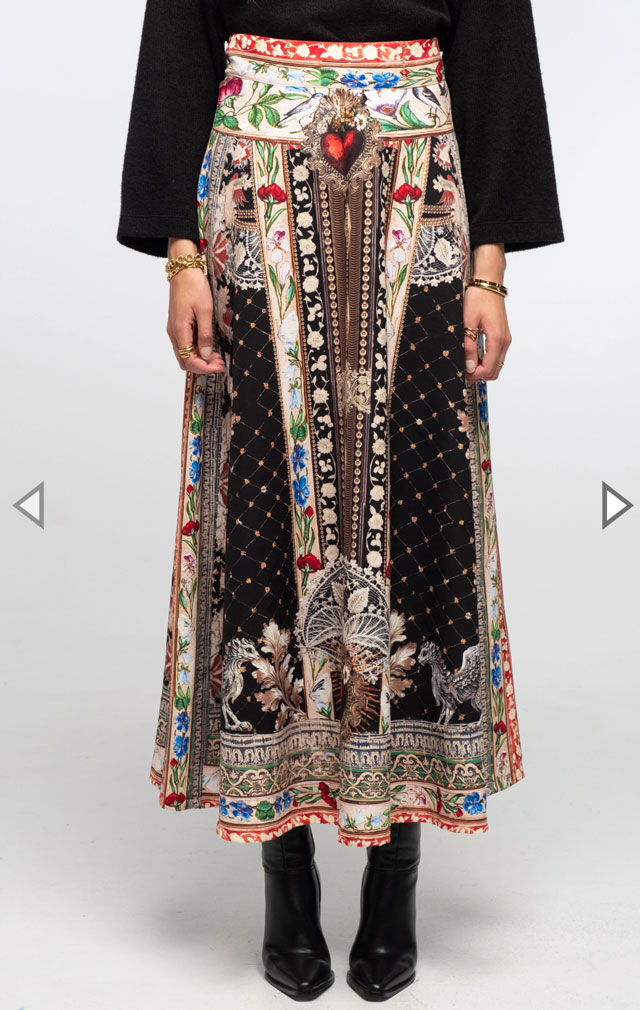 Una abundancia de flores en tonos joya, criaturas míticas, entramados y encaje decoran el estampado de nuestra Falda Larga Opulence. Su tela rica y pesada crea una silueta evasé, mientras que la cremallera trasera invisible garantiza un ajuste perfecto. Luce la cintura alta de esta romántica falda.