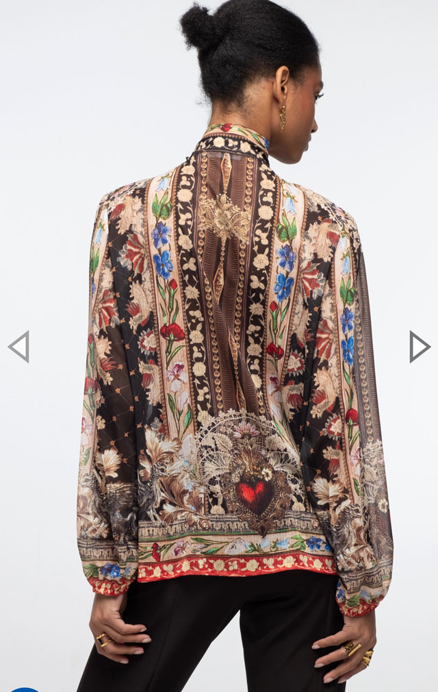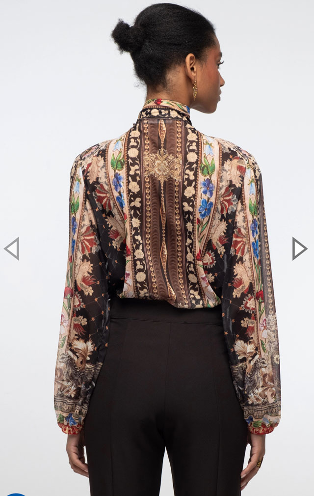 Un intrincado estampado tipo tapiz y georgette arrugado transparente se combinan en nuestro top Opulence. Esta blusa con escote en V tiene lazada en el cuello y mangas largas con puños elásticos. Llévala por dentro de los pantalones Onyx para un look elegante y femenino o déjala por fuera para lucir su dobladillo con ribete estampado.