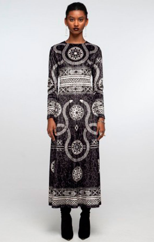 Con un estampado monocromático sobre terciopelo brillante, nuestro vestido largo Philosophy presenta místicos motivos de serpientes, mandalas y un fondo con efecto craquelado. Los detalles del dobladillo y la cintura evocan el arte textil tradicional, mientras que las mangas largas realzan la femenina silueta en forma de A.