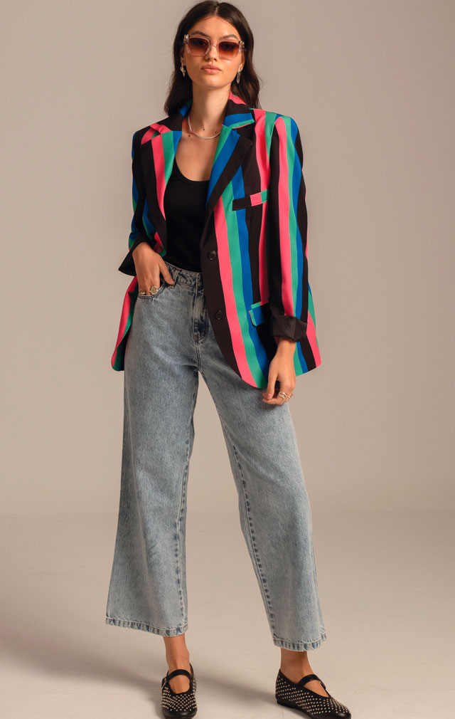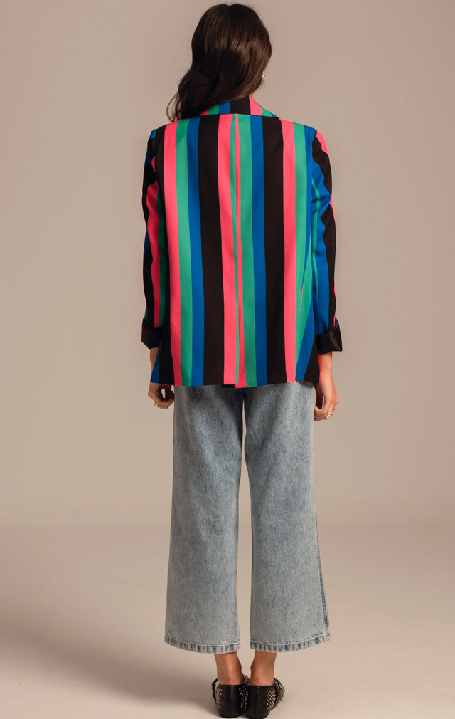 Arremángate las mangas forradas de satén negro de nuestro Radiant Blazer para lucir un estilo informal y elegante. Esta chaqueta de sarga de botonadura sencilla tiene bolsillos con solapa. Presenta un estampado de rayas de colores que se puede llevar con una camiseta de tirantes básica de canalé en negro y pantalones Radiant a juego para lograr un estilo moderno.
