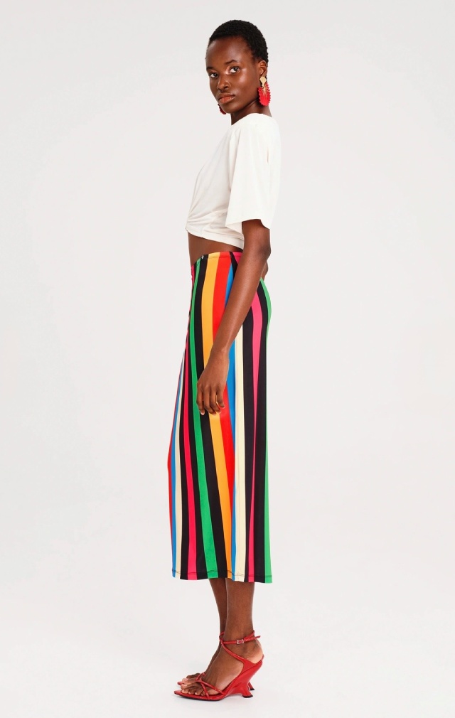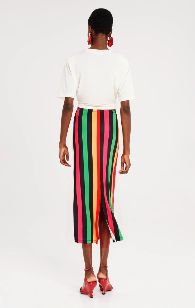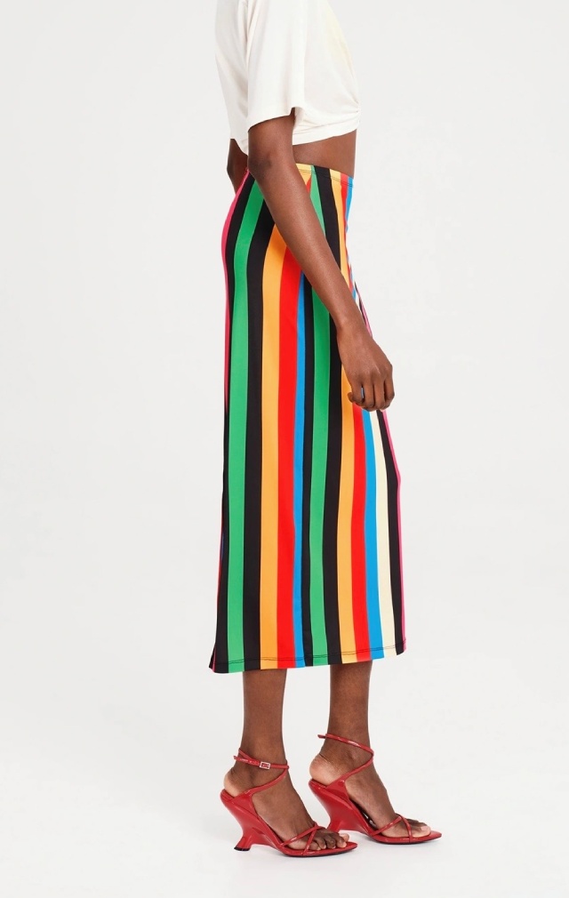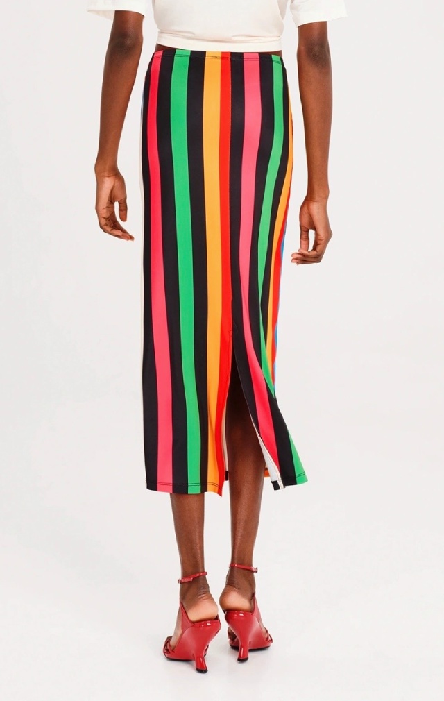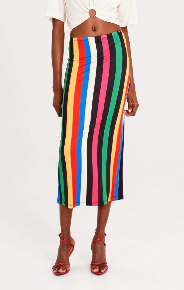 Nuestra falda midi Rhythm combina comodidad y color con un estampado integral de llamativas rayas verticales. Confeccionada en suave tejido de punto elástico, esta falda midi recta cuenta con una abertura trasera para mayor libertad de movimiento, cintura elástica para un ajuste perfecto y una etiqueta tejida que le añade el toque distintivo de la marca. Para un look primaveral completo, combínala con un top corto Enigma en blanco.