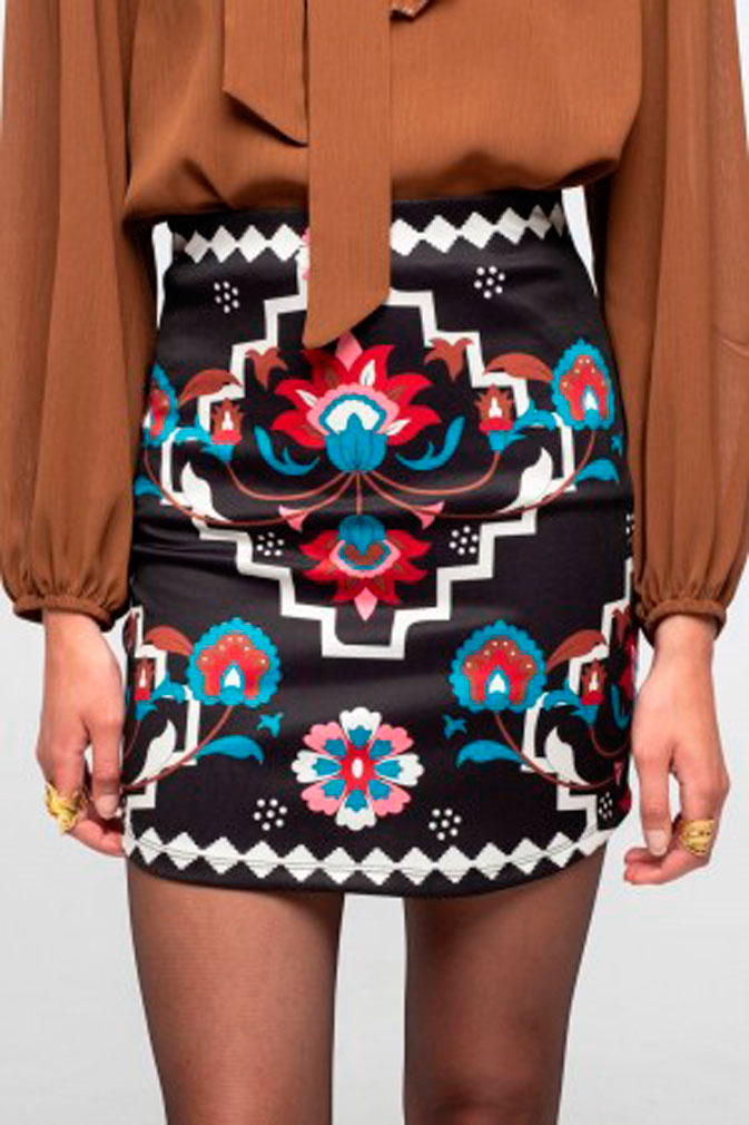 Nuestra minifalda Romancer luce un estampado simétrico con vibrantes estampados florales y detalles geométricos. Confeccionada en crepé negro, esta minifalda ajustada tiene cinturilla elástica y cintura alta.