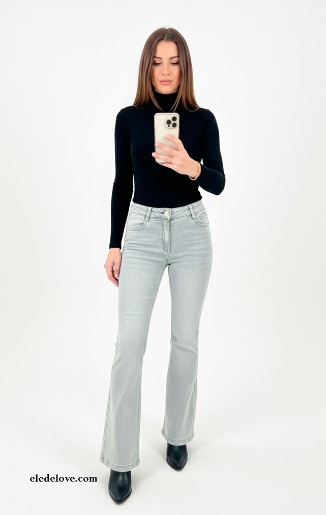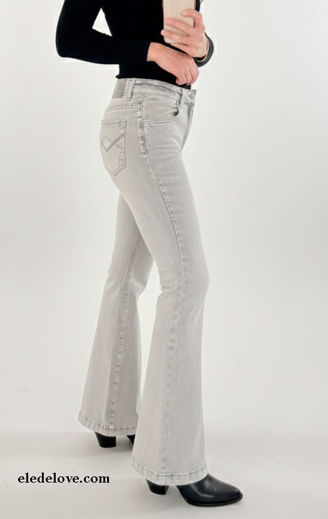 VAQUERO 5 BOLSILLOS ELÁSTICO Y ACAMPANADO CON CIERRE DE CREMALLERA Y BOTON. DIBUJOS CON COSTURAS EN LOS BOLSILLOS TRASEROS QUE FAVORECEN LA FORMA VISUAL.