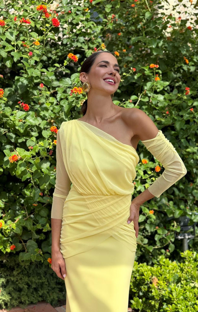 VESTIDO AJUSTADO ASIMETRICO CON UN HOMBRO CUBIERTO Y OTRO AL AIRE QUE SE COMPLEMENTA CON UNA MANGA DE TUL.