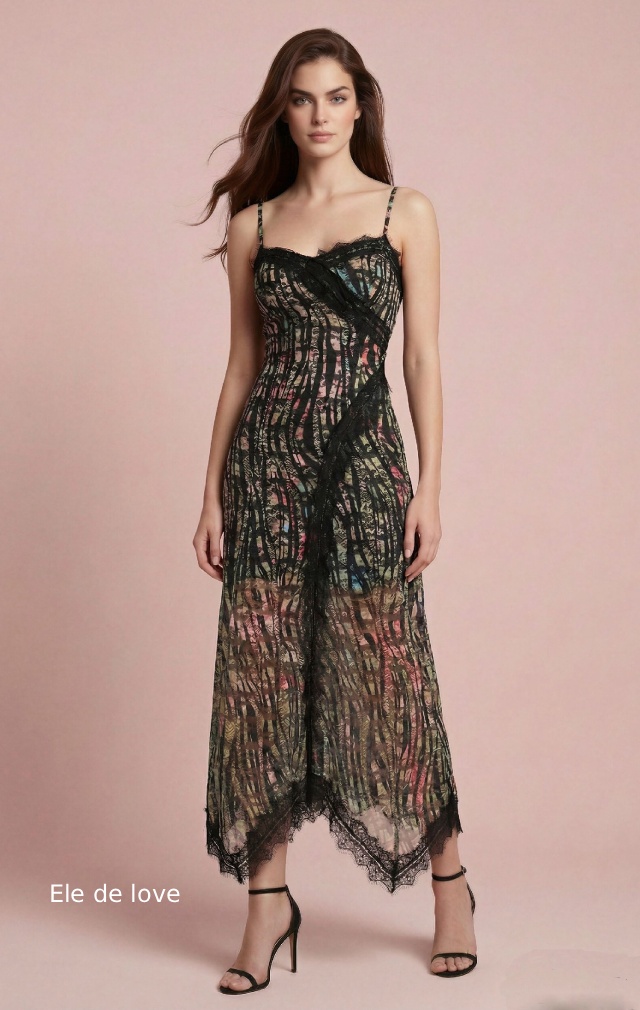 VESTIDO DE TIRANTES EN ENCAJE ESTAMPADO CON PUNTILLA NEGRA EN EL ESCOTE Y EL BAJO, LLEVA FORRO NEGRO CORTO.