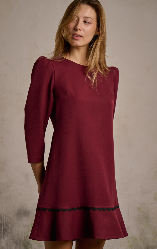 VESTIDO DE MEDIA MANGA CON CUELLO REDONDO Y MANGA ABULLONADA, DETALLE DE VOLANTE EN EL BAJO CON FENEFA EN NEGRO. CIERRE DE CREMALLERA OCULTA EN LA ESPALDA.