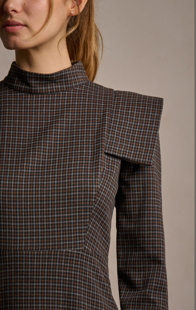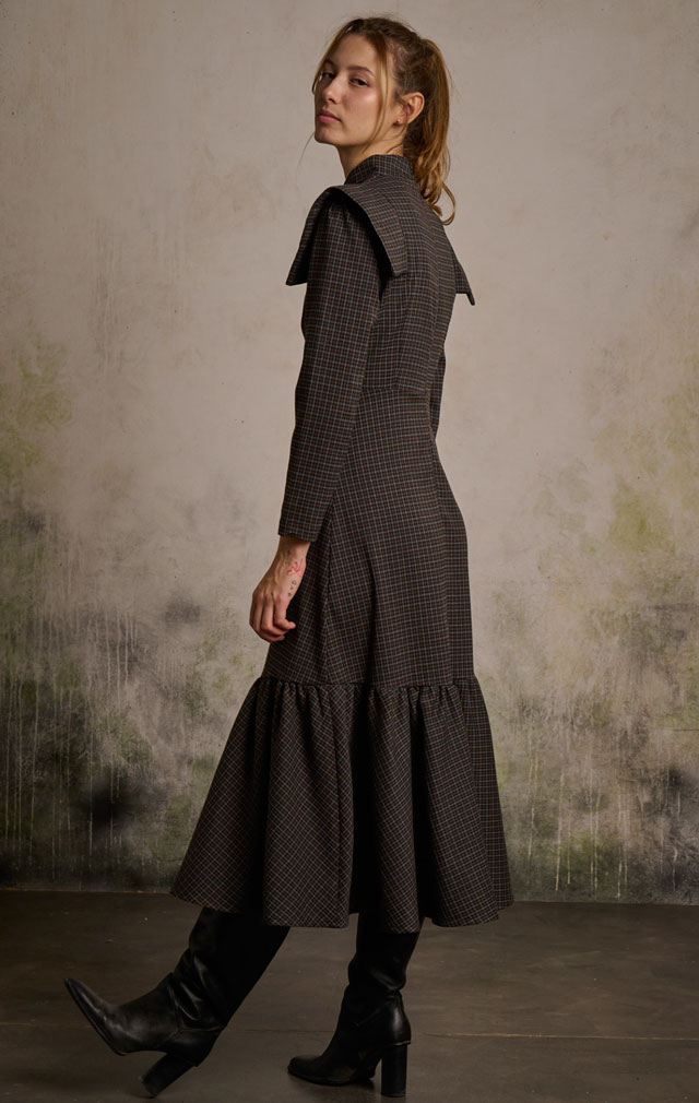 VESTIDO DE LARGO MIDI CON MANGA LARGA Y HOMBRERA MARCADA, VOLANTE EN EL BAJO, CIERRE DE CREMALLERA OCULTA EN LA ESPALDA. UNA NUEVA FORMA DE VESTIR.